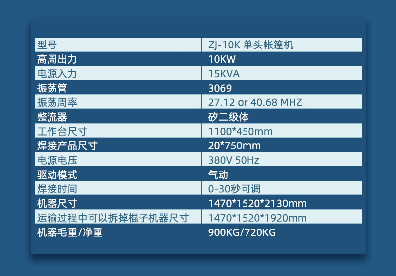 適用(yong)于汽車(che)篷佈颿佈接駮、帳篷佈熔接、電影幙佈熔接、膜結構拼接、戶(hu)外膜結構銲接、膜結構熔接、戶外遮陽佈(bu)熔接(jie)、廣告噴繪(hui)佈銲接、PVC佈熔接或含有PVC成分的任何材質的輭性塑膠塑料的(de)高週波熔接或拼接。