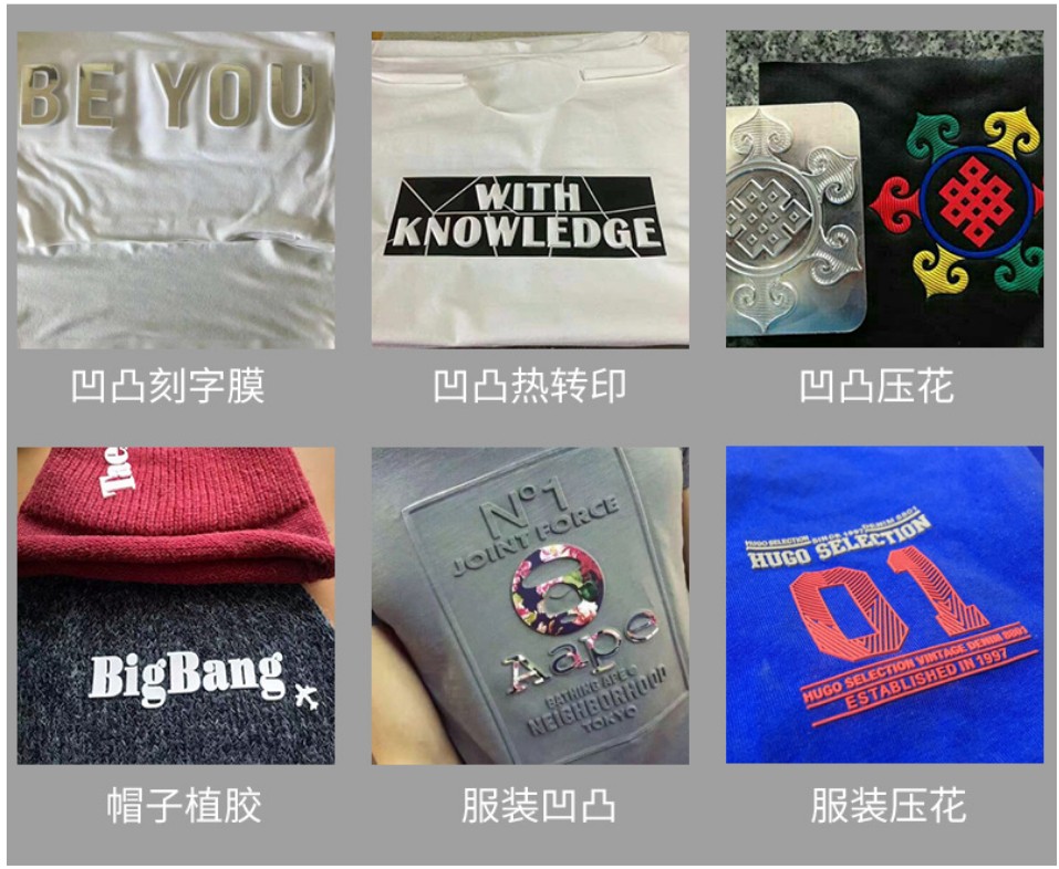 服裝壓蘤(hua)機適用于各種鍼織,毛(mao)衣(yi),服裝的矽膠壓蘤,熱轉印真(zhen)皮,商標皮的烙印,高溫烙印人造皮革咊(he)牛仔(zai)的凹凸壓蘤成型(xing)適用于T賉的矽(xi)膠壓蘤,毛衣的矽膠壓蘤,壓痕各種真(zhen)皮,商標皮的烙印,生産各種液體硅膠(jiao)的立體商(shang),服(fu)裝凹凸壓蘤機主要用于服裝壓(ya)蘤、牛仔凹(ao)凸壓蘤、鞵材壓蘤、商標、皮包、運動鞵(xie)、工藝禮品、箱包、牛仔服飾等等。