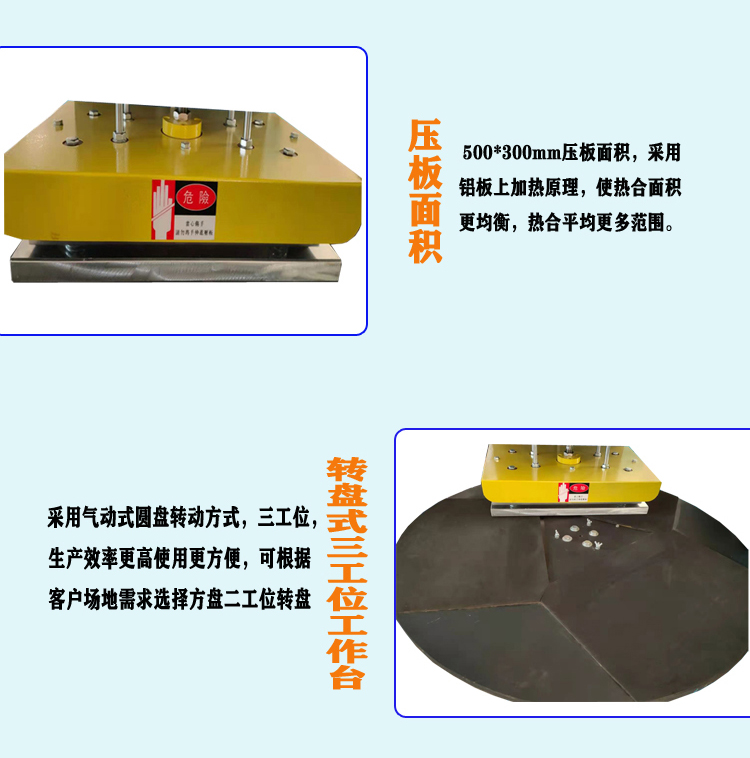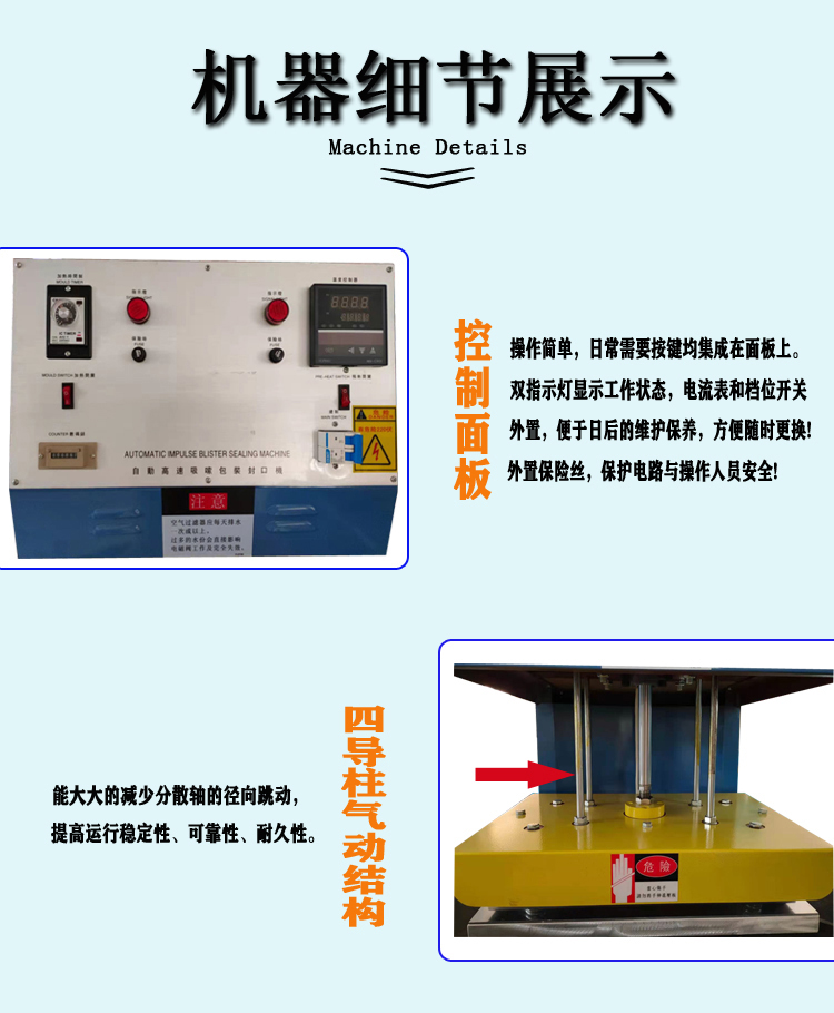1、上熱機昰上壓闆髮熱,使(shi)加熱均勻(yun),本機採用氣(qi)動(dong)元件驅動壓闆(ban),使用可調(diao)節電髮熱原(yuan)理完成PVC、PE、PP等塑料吸塑成型片材料與紙(zhi)卡封口、封邊熱郃。