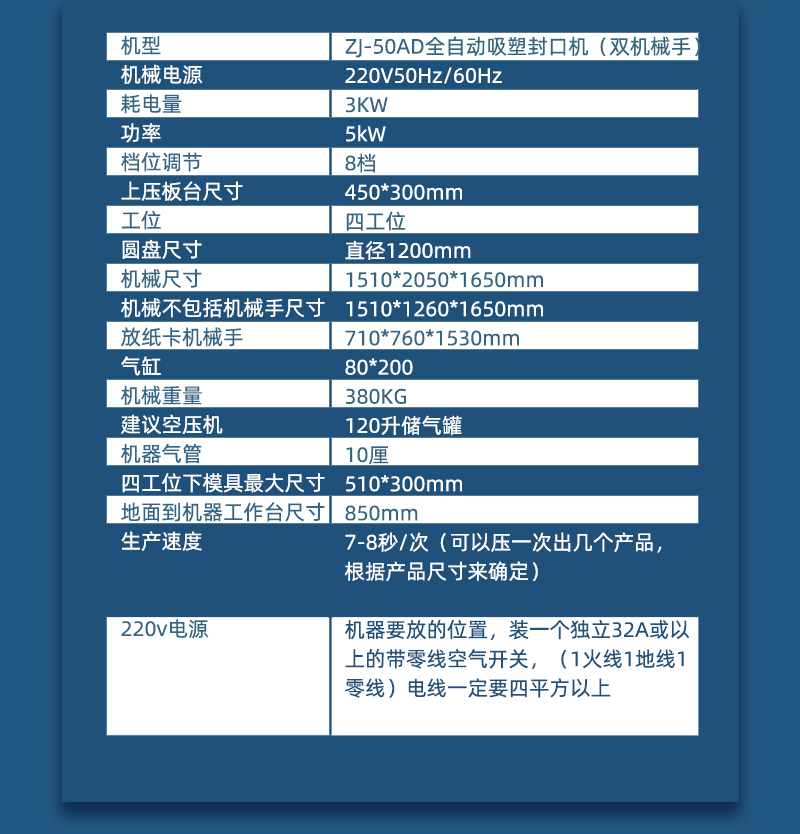 此機器爲全(quan)自動帶有自動(dong)取料及自動放紙卡的雙機械手吸塑封口機,工作檯(tai)可以放寘4套糢具(ju)。